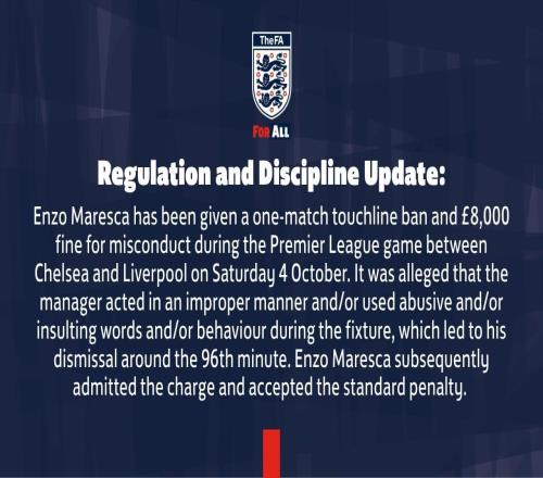 北京时间10月15日,英足总官方发布公告,公布了对马雷斯卡的处罚措施,后者在对阵利物浦的比赛中被红牌罚出场外。...