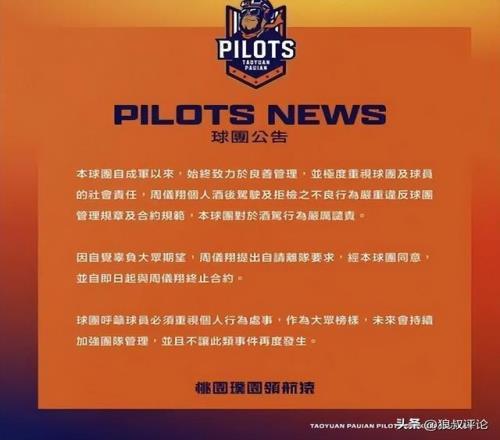 去年,周仪翔因酒驾拒检引发外界的热议,P联赛桃园领航猿队官方宣布,球员周仪翔酒后驾驶并抗拒检查,违反了球队的相关条例规定,自今日起正式终止与其合约。