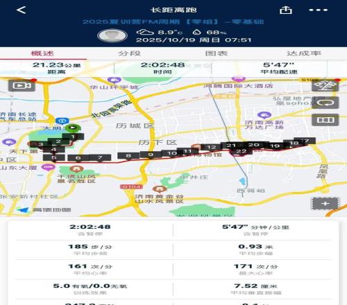 早上六点四十五分我到达起点处,感觉济南马拉松进场有点拥挤、通行效率不高,安检、进场、存包等环节都有点拥堵,约半个多小时才完成进场流程进入起跑等候区。虽然起点区域人多有点拥挤,我仍努力完成训练营学到的那一整套热身动作。我独自一人默默地、严肃地热身,再加上我这一身还貌似比较专业的服饰,想必周围人没准儿误以为我是一个“老手“,其实我仅仅是刚参加了第二场半马的”老菜鸟“而已。7点45分枪响后,我大概用了四五分钟才通过计时起点,通过起点后我开表计时,并打开事先设好的节拍器(186步频)帮助自己维持步频。