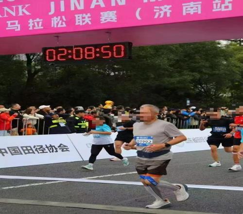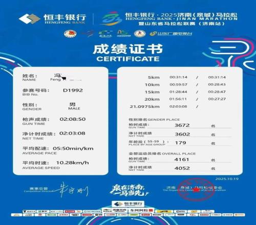 不知道是跑姿吸引,还是步频器的吸引?更或许是一头白发引人关注,七八公里后有个年轻小伙一直跟着我并排跑。他年龄还不到40岁,我鼓励了他几句,并叮嘱他“保持节奏“。10公里后我感觉我一直在超越别人,很少有人从后面超过我,只有在18公里后才觉得开始被人超过。济南赛道难度最大的是17、18公里是接近2公里的大长上坡,很考验体能和意志力,之后折返原路返回、接下来是接近2公里的长下坡。对于膝盖有旧伤的我来说,这段下坡只能收着点跑(感觉就是在这段时间才有不少人超过我)。20公里后又是一个接近1公里的上坡,临近终点才有2百米左右的平缓路面。最后一公里赛道是个上坡,不知道是体能剩余不足,还是感觉今天配速超预期太多,这一公里我没敢全力冲刺,最后一两百米平缓赛道我提前查看手表估算肯定能跑进2:03之内(实际我开表时间是过了起点计时带、稍微滞后10来秒,导致我手表成绩快于实际计时成绩),为了享受最后100米赛道、也为了冲线有个轻松愉悦的表情避免龇牙咧嘴,我留给终点一个美好pose,匀速跑过终点
