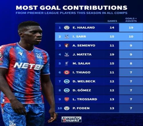 11月7报道 德国转会市场统计了英超球员本赛季各赛事的参与进球数量,并列出榜单,哈兰德参与19球居首,萨尔参与10球次席。